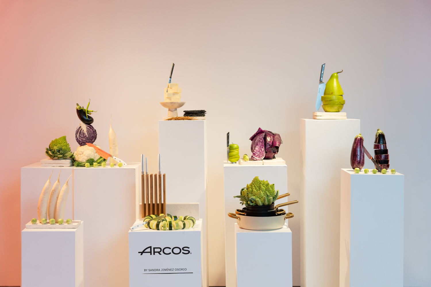 The installation, designed by food stylist Sandra Jiménez Osorio, explored the relationship between cutting and raw materials. From the toughness of a red cabbage to the softness of butter, each totem showcased the versatility of Arcos knives.